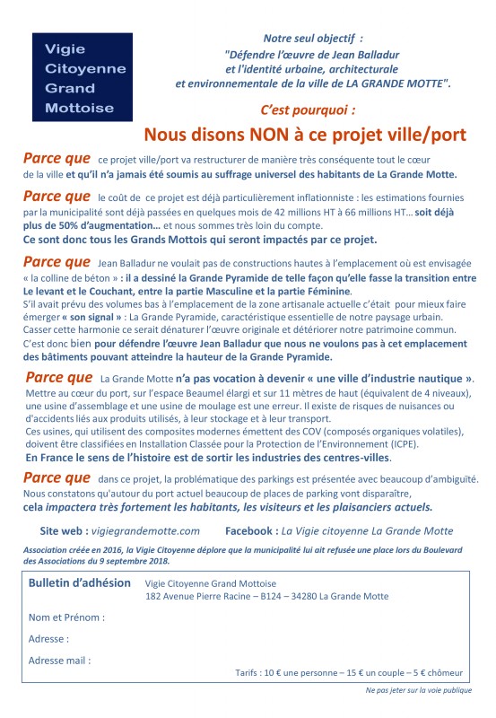 La Vigie citoyenne est une association de loi 1901, créée en 2016, et dont le seul objet est de défendre l'identité urbaine, architecturale et environnementale de la ville de LA GRANDE MOTTE.